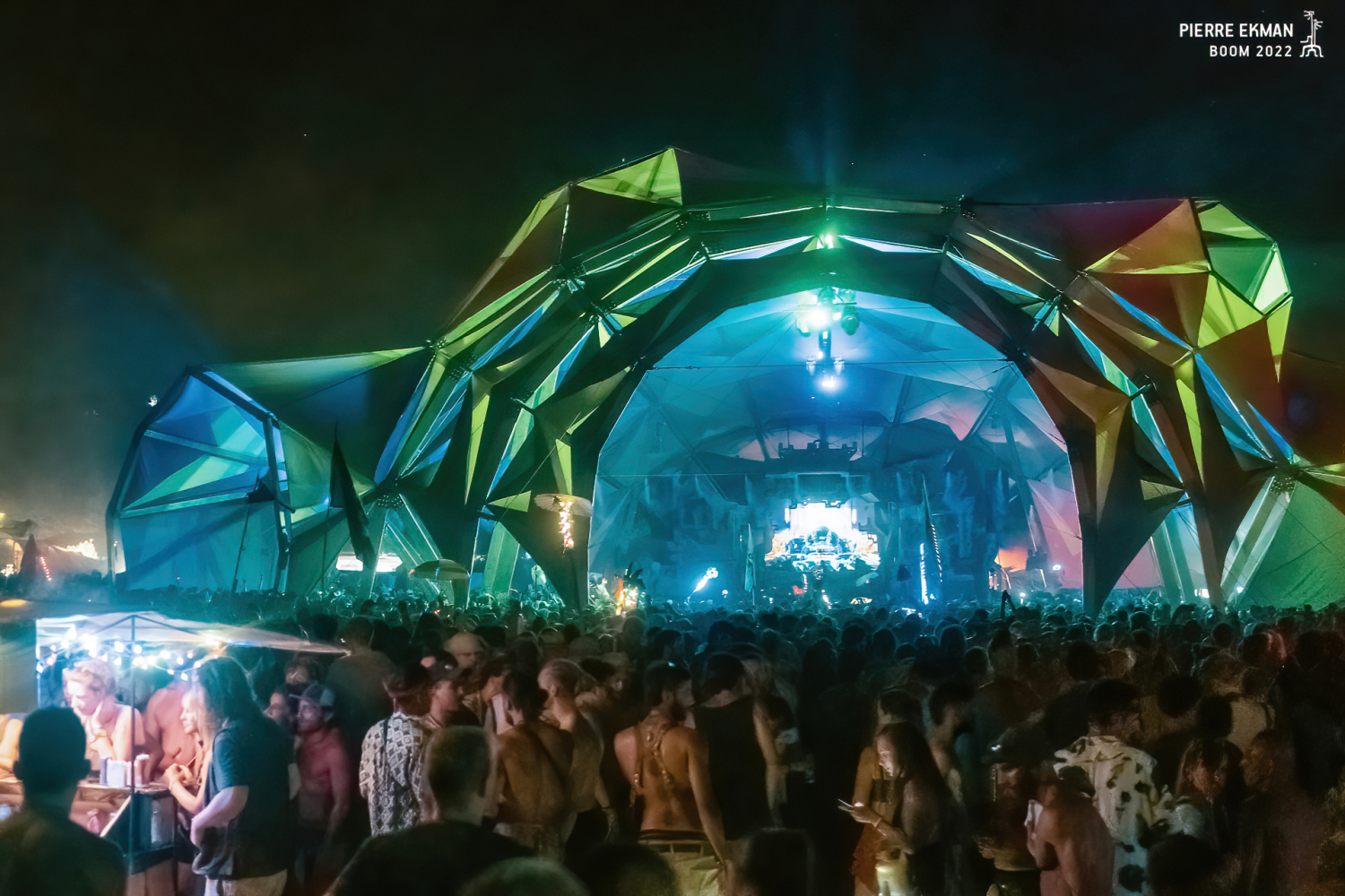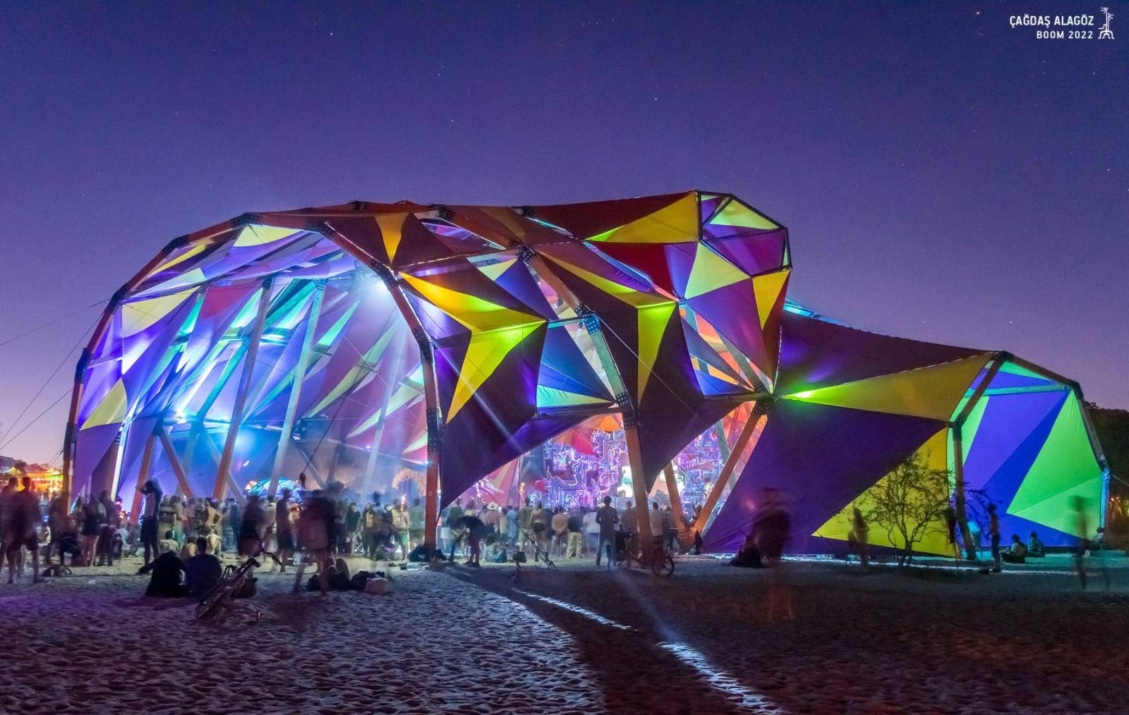 Throughout the inside space, the wooden arches and skin layers come alive with the light and sound design, immersing boomers in a collective and pulsating rhythmic experience.